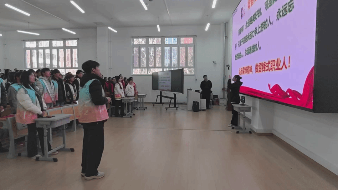 分享环节后,青春誓言宣誓环节正式开启。全体同学起立,身姿挺拔、神情坚毅,高举右拳庄严宣誓:“青春啊!永远是美好的,可是真正的青春,只属于这些永远力争上游的人,永远忘我劳动的人,永远谦虚的人。弘扬雷锋精神,做雷锋式职业人!”铿锵有力的誓言响彻全场,既饱含着青年学子对美好青春的执着追求,更凝聚着践行雷锋精神、勇担时代使命的坚定决心。激昂的宣誓声不仅点燃了现场每一位师生的热情,更将雷锋精神的种子深深植根于青年心中,进一步激发了大家以实际行动传承奉献品格、锤炼职业素养,在青春赛道上书写雷锋式职业人担当的昂扬斗志。